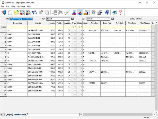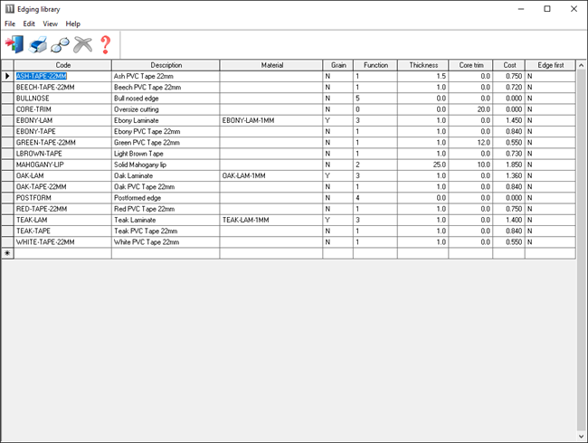 - The edging library holds description, thickness and cost of all of your edging and laminating materials including tape and solid lipping.