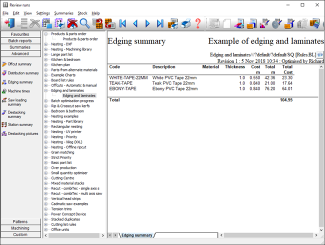 - The edging summary lists total linear measure and cost of each edge material required for each job.