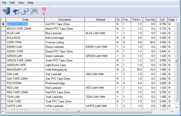 Details of each edging material are stored in a database. There is a record for each material and each material has a unique code. The program uses this information when calculating the edging required for a run and when producing the laminate sizes for a cutting list. At the main screen:-