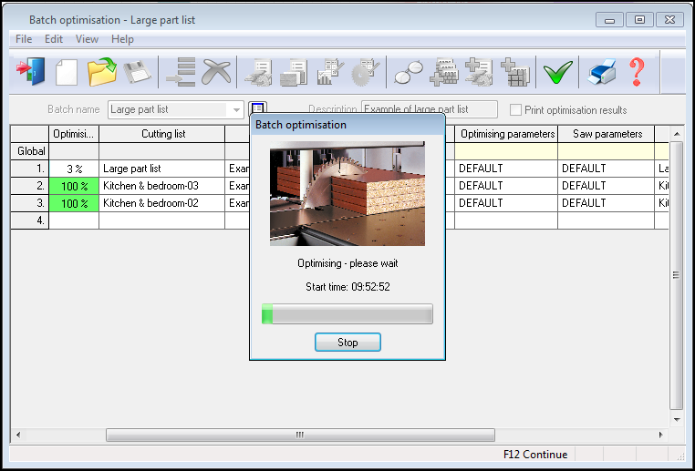 Batch optimisation is useful where parts lists have to be optimised in separate lists for each material; the set of runs can be kept together for analysis and optimisation. Batches can also be used to set up comparisons, for example, where the same parts list is optimised against different sets of parameters. To do this, at the Main screen:-