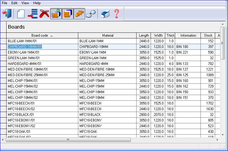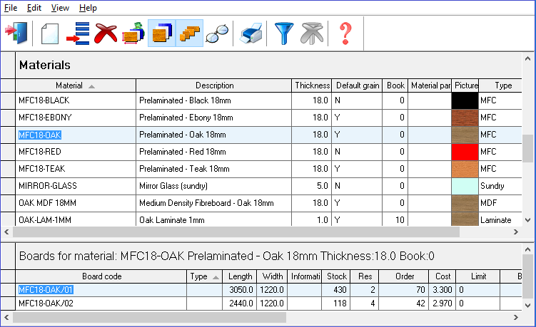 The main options are on the Toolbar at the top of the screen. The top pane shows the materials and the lower pane the boards for the selected material.