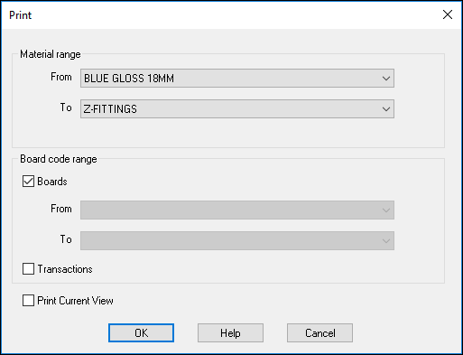 If more than one material is selected the print includes all board sizes for each material. If printing only 1 material the range of boards to print can be selected.