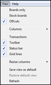 Sets which columns in each list (Materials, Boards, Transactions) are shown. To use this select an item from the sub menu. e.g. Columns - Material. The program displays a list of the available columns. Check the box against each column to show the column on screen.