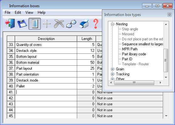 Part list data can be extended and customised beyond the fixed fields to include extra data. For example, tracking information, edging data, storage data, destacking information, nesting instructions, and additional part details for printing on labels. There are a set of information boxes (fields) that can be used to extend the capabilities of the Nesting optimising or modify the operation of some nesting parameters.