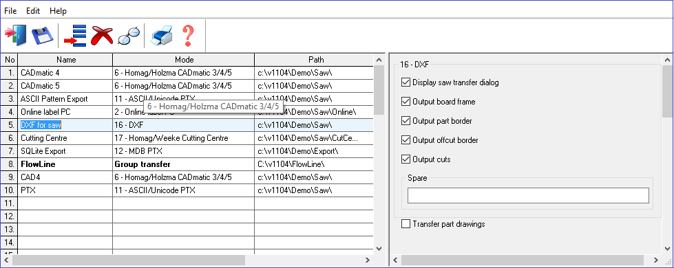 Give the transfer a suitable name e.g. 'DXF transfer' - this appears on the Saw Interface menu at the main screen