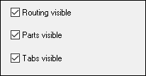 The visibility of the routes, the parts and the tabs can be turned on and off using the visibility check boxes: