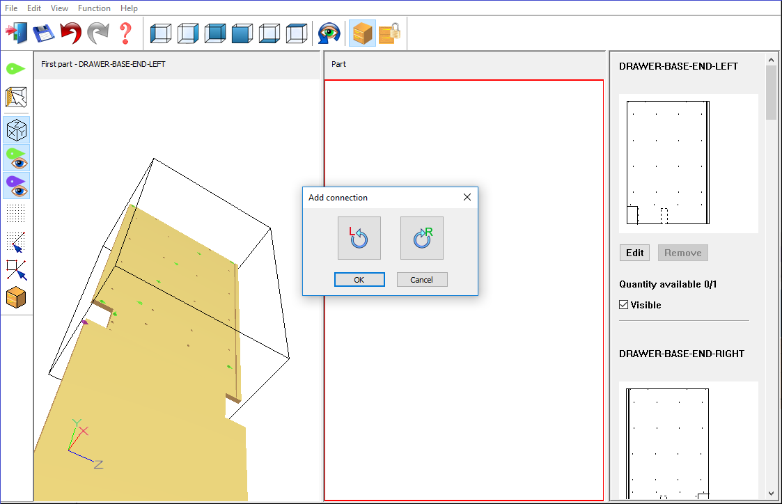 As with connecting two parts together using drill instructions the ‘Add connection’ dialog will be shown. However since a two end grooves will only fit together in two possible ways the rotation buttons will switch the parts between their two possible relative orientations.