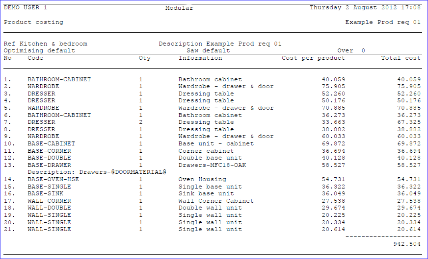 The report shows the cost for parts, sub-assemblies, fittings, and operations - a complete breakdown of the cost of manufacturing for each product.