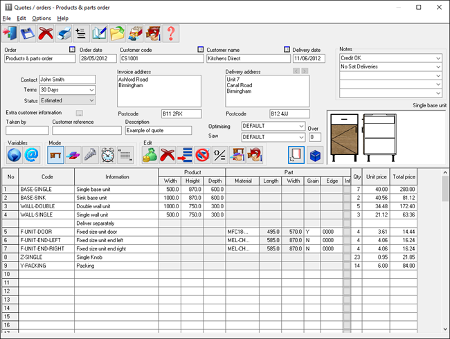 - Customer database with full contact details, invoicing address, multiple delivery addresses, discounts and free-format notes fields.