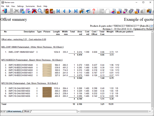 - The optimiser considers available free stock (physical stock less allocations) and automatically adjusts stock after cutting.